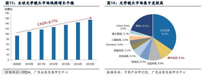 智能手机时代,光学镜头市场规模保持了平稳的增长势头。2009年到2015年间,受益于智能手机的增长,全球光学镜头市场规模实现了年复合增长率8.77%的持续增长,2015年全球光学镜头市场规模已达154亿美元。