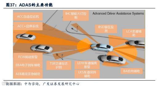 其中L0~L2阶段,主要是ADAS(Advanced Driver Assistant System,高级驾驶辅助系统)的应用普及阶段。ADAS可以实现多种主动安全功能,伴随ADAS渗透率与融合度的提高,汽车的智能水平得到显著提升,并过渡到L3水平。当无人驾驶技术进入L3阶段后,可以有条件的实现无人驾驶。借助于成熟的车联网(V2X),最终将实现完全的无人驾驶,即L4阶段。因此,ADAS的普及和融合既能促进单车的智能化,同时也是无人驾驶实现的基础条件。