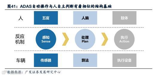 ADAS的实现方式和人对外界信息进行反应的机制十分相似。人通过“五官”对周边信息进行感知,对应到ADAS和无人驾驶,就是传感器的感知端;对信息进行思考和处理并做出决策,人依靠的是大脑的思考和判断,而ADAS则依靠算法实现;最后,人通过肢体表现应对环境信息的变化,而ADAS则通过执行器来完成决策层做出的最后指令。其中算法是整个ADAS的核心。