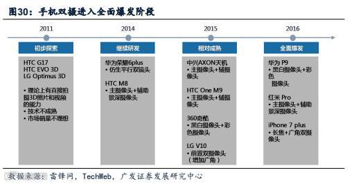 从2011年HTC、LG等手机厂商初步探索双摄应用开始,经过几年的发展,目前双摄已经进入全面爆发阶段,搭载双摄的手机厂商包括苹果、华为、小米、中兴、酷派、中兴、HTC、LG、乐视等。