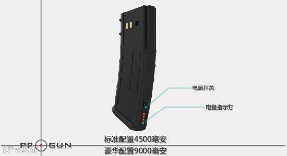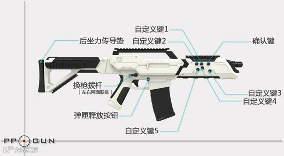 PP GUN依据人体工程学的结构设计,配备皮卡丁尼战术导轨,可自由安装特色配件。枪身内部有内置蓝牙和陀螺仪模块,可追踪游戏画面。此外,PP GUN还配备了多个按键,玩家可自由定义游戏动作以进行游戏操作。装备9000毫安的弹夹形电源,可拆卸作为移动电源使用。设计人员还专门设计了震动反馈枪托,为游戏营造更逼真的射击效果。