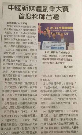 10月20日,2015中国新媒体创业大赛海峡赛区来到台北,见证了当地的创业热情和创客们的风采。本届大赛首次开设了台北赛区,为的是搭建一个平台,让两岸的创客精英团队能同台角逐、同台竞技。12支台湾创客精英团队带着项目现场路演,并接受了评审团的现场提问。最终,“AirSig空中签名:移动端身份认证”和“FLiPER潮流艺文志”两项目胜出,他们将获得主办方提供的创业空间、投融资、市场渠道等一揽子服务。同时,他们还将参加于11月在杭州举行的2015中国新媒体创业大赛总决赛。