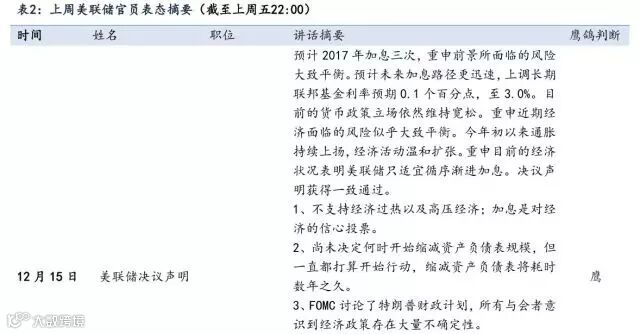 国际形势上,上周美联储FOMC无意外地全票通过将联邦基金利率上调25个基点,同时将2017年加息的次数预期上调到3次,超过市场预期的2次,部分委员已经将新政府潜在的扩张性财政政策考虑在内。耶伦同时表示,美联储随时可能开始缩表。整体来看联储的表态比市场预计的要更为鹰派。加息决定发布后,美股和黄金下跌、美债收益率上行。新兴市场货币再次承压。