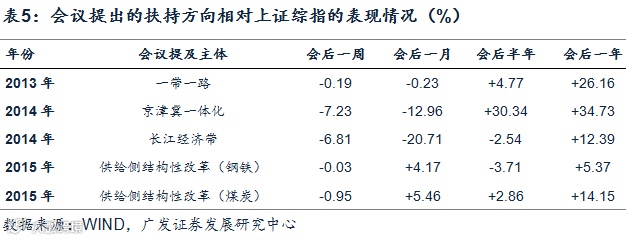 中央经济工作会议提出的新扶持方向所涉及的板块在短期内表现一般,但把时间拉长至一年都能明显跑赢大盘。无论是2013年底会议提出的一带一路概念、2014年底会议提出的京津冀一体化概念和长江经济带概念、2015年底会议提出的供给侧结构性改革所涉及的煤炭、有色、水泥等板块,均在一年后明显跑赢了大盘。