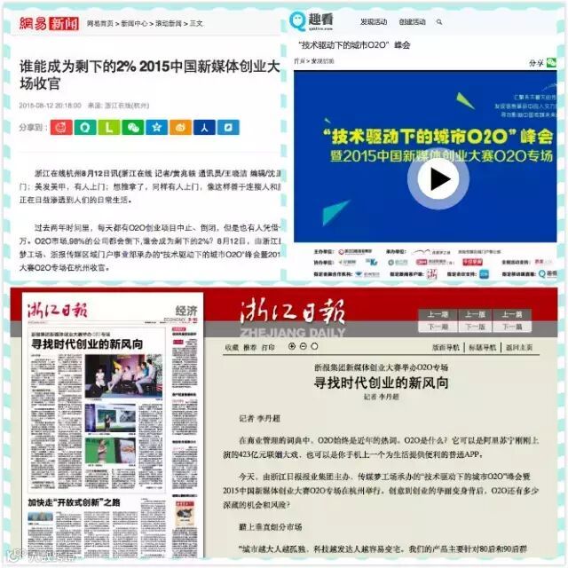 本场活动吸引了众多媒体报道传播,《浙江日报》大篇幅报道了本次活动,并深入浅出地点评了目前O2O领域的创业潮。今天在《钱江晚报》、钱报网、浙江在线、网易、搜狐、世界浙商网、杭州网等媒体平台上也看到了更多本次活动的详情,浙江新闻客户端、新华社“我在现场”app全程活动图文直播,趣看app全程视频直播。