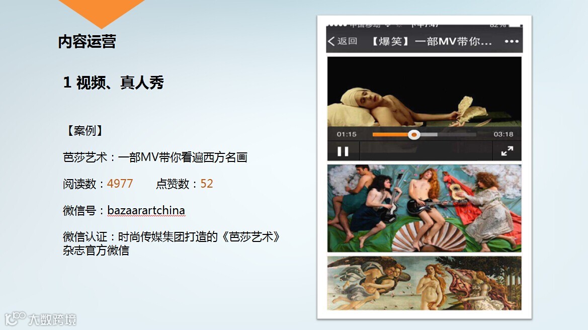 视频、真人秀、电台等丰富多彩的形式,可以为艺术资讯提供更多表达空间。比如,芭莎艺术的一则视频:一部MV带你看遍西方名画。阅读数达到4977,适合喜欢“轻”阅读的年轻用户。