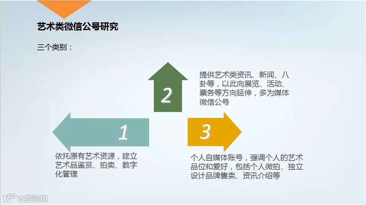 目前,艺术类微信公号可分三类:一是,依托原有艺术资源,建立艺术品鉴赏、拍卖、数字化管理;二是,提供艺术类资讯、新闻、八卦等,以此向展览、活动、票务等方向延伸,多为媒体微信公号;三是,个人自媒体账号,强调微信主人个人的艺术品位和爱好,包括个人微拍、独立设计品牌售卖、资讯介绍等。