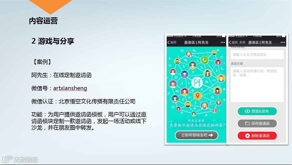 比如,阿先生微信号为用户提供在线定制邀请函的功能。用户提供邀请函模板,发起一场活动或线下沙龙,在朋友圈中转发。微信号在服务用户的过程中,传播品牌影响力。