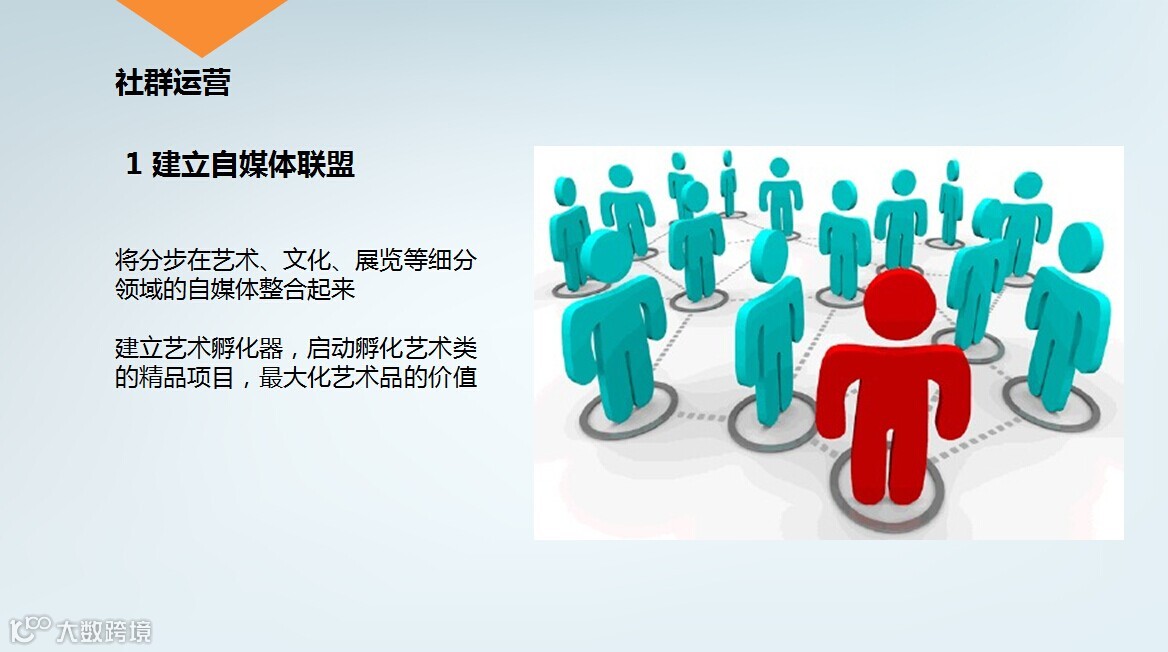 社群运营有许多方式,我们认为,较为有效的方式是建立艺术类的自媒体联盟平台,将分布在艺术、文化、展览等细分领域的自媒体整合起来。
