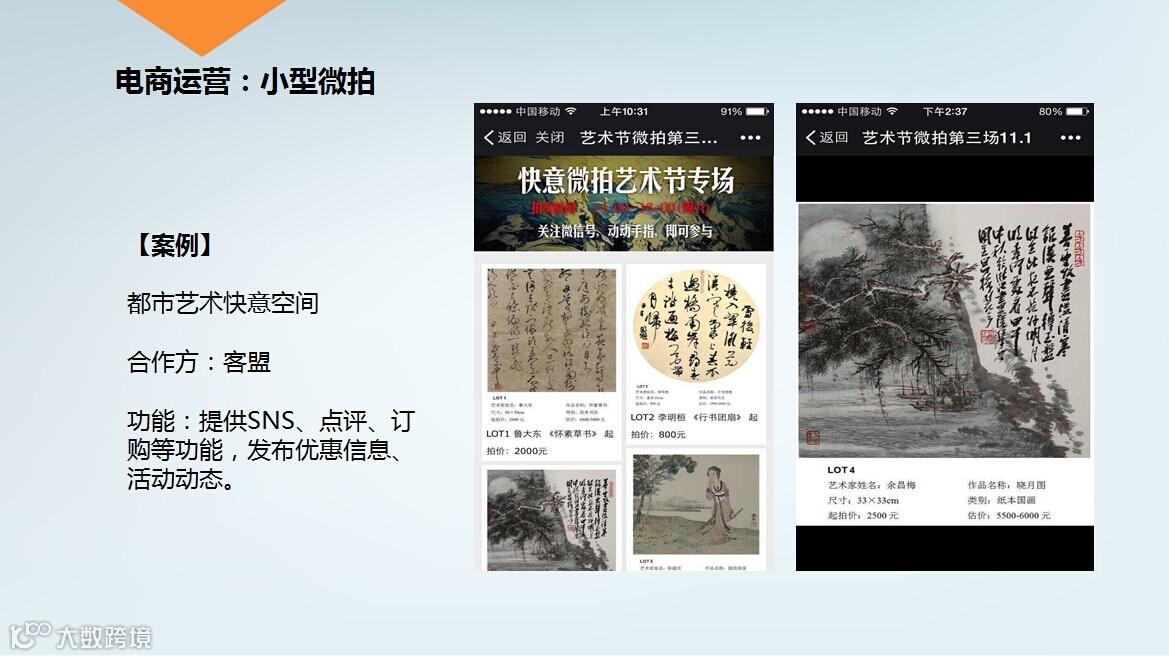 小型艺术品微拍更适合媒体类微信公号的市场定位。一是微拍的交易成本低,在“阿特姐夫”群里,买卖双方只需各交纳5%的佣金。二是微拍有社区模式,大家可以就着拍品聊艺术话题,轻松随意;三是拍品价格低,交易成本低,容易让人接受。