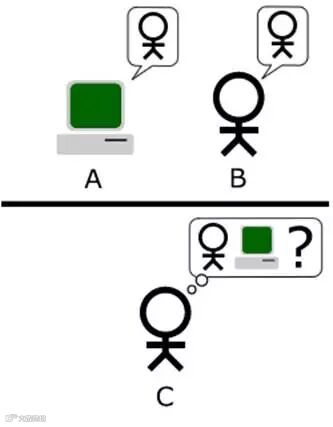 (图灵测试的标准模式:C使用问题来判断A或B是人类还是机械。对象为:一个具有正常思维的人(代号B)、一个是机器(代号A)。如果经过若干询问以后,C不能得出实质的区别来分辨A与B的不同,则此机器A通过图灵测试。)