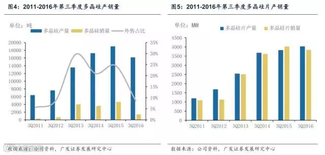 第三季度多晶硅销量大幅下跌,多晶硅片销量小幅减少。2016年三季度国内光伏装机量下降,光伏材料需求走弱,公司第三季度生产多晶硅16160吨(-15.0%),对外销售1398吨(-70%),生产多晶硅片4031兆瓦(+5.4%),销售多晶硅片3837兆瓦(-4.6%)。2016年第三季度多晶硅外售比例仅9%,较2015年同期下调15个百分点。