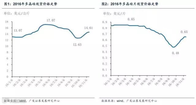 三季度光伏装机骤冷,光伏材料需求随之降低,价格持续下跌。10 月份价格出现反弹,多晶硅价格较三季度提升 15.5%,多晶硅片价格提升 35.4%。公司 2013 年-2016 年多晶硅片产销量呈上升趋势,且四季度销量通常为全年最高水平,预计 16 年四季度光伏材料行业回暖,多晶硅、硅片市场需求提升,且公司未来两个月多晶硅及硅片订单饱满,预计库存仍将维持在较低水平,由此我们预计四季度多晶硅及硅片价格将持续回升。