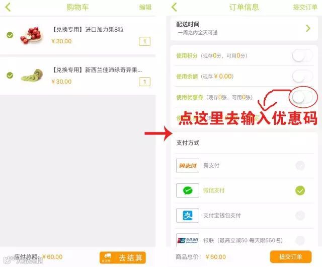 结算时,在优惠券处输入优惠码