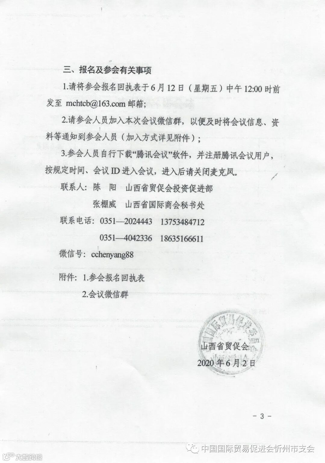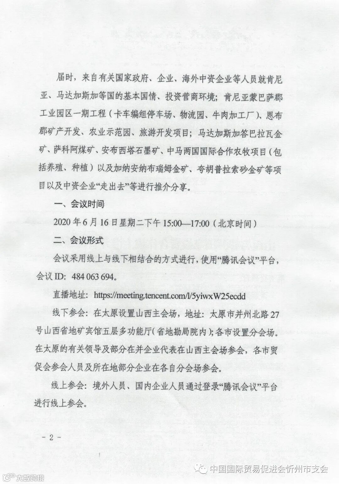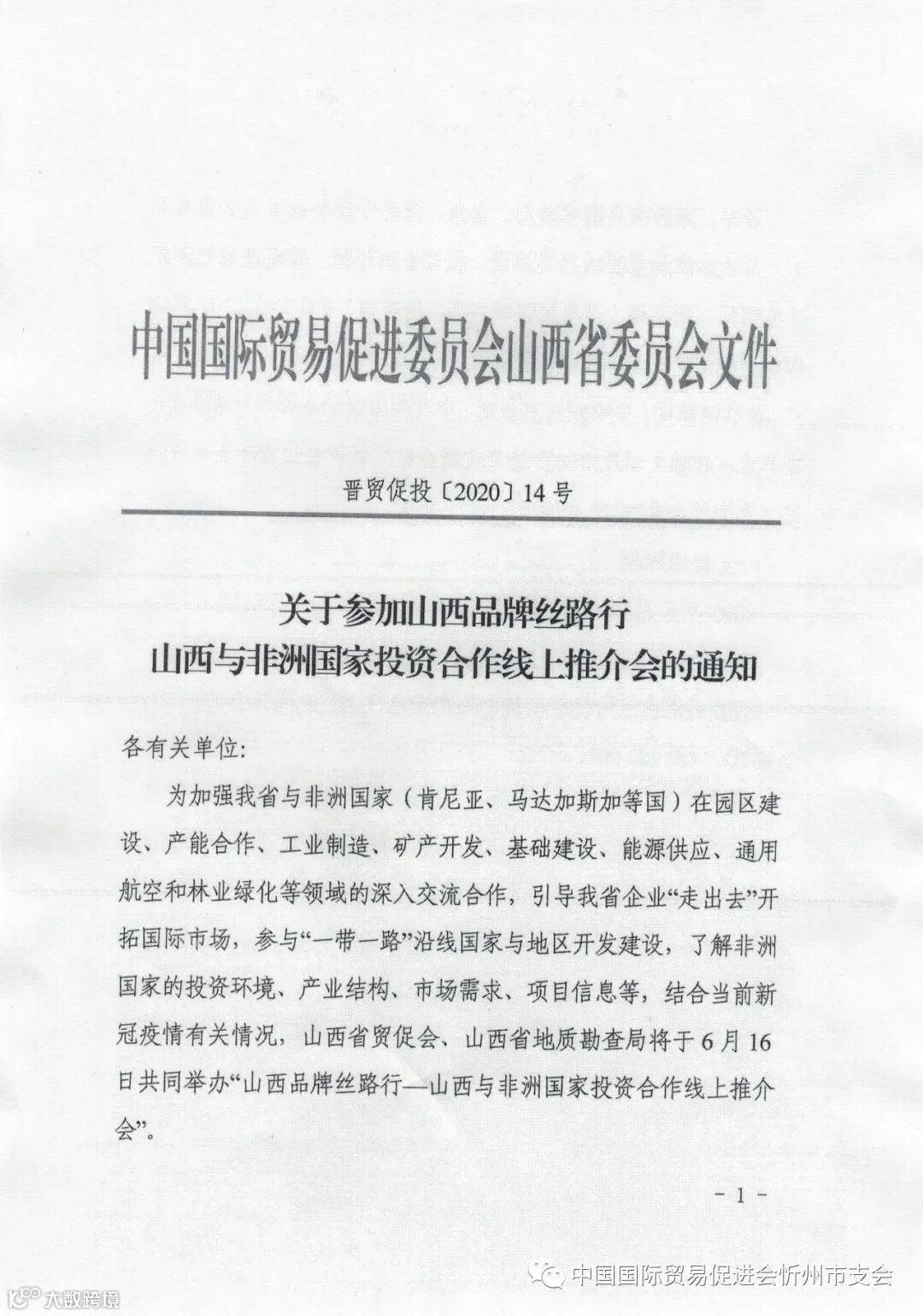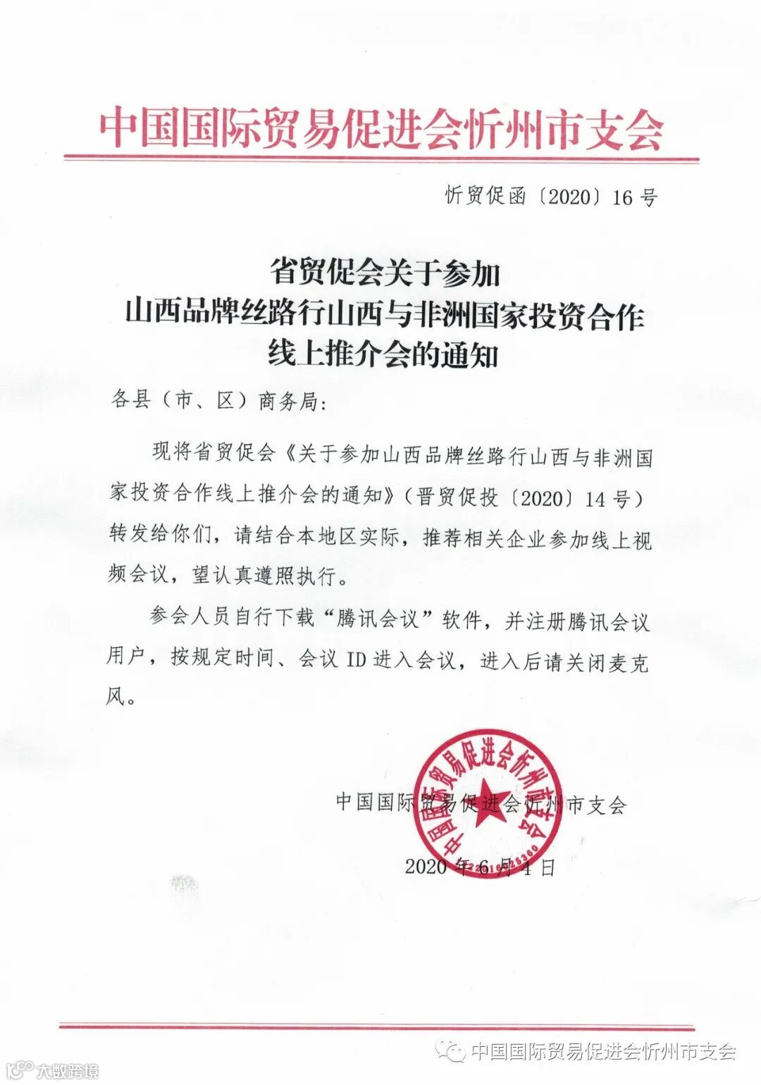 中国国际贸易促进会忻州市支会为进一步引导我省企业“走出去”开拓国际市场,参与“一带一路”沿线国家与地区开发建设,了解非洲国家的投资环境、产业结构、市场需求、项目信息等,把省贸促会《关于参加山西品牌丝路行山西与非洲国家投资合作线上推介会的通知》(晋贸促投〔2020〕14号)文件转发到各县(市、区)商务局,要求组织辖区内有需求的企业参加线上视频会议。
