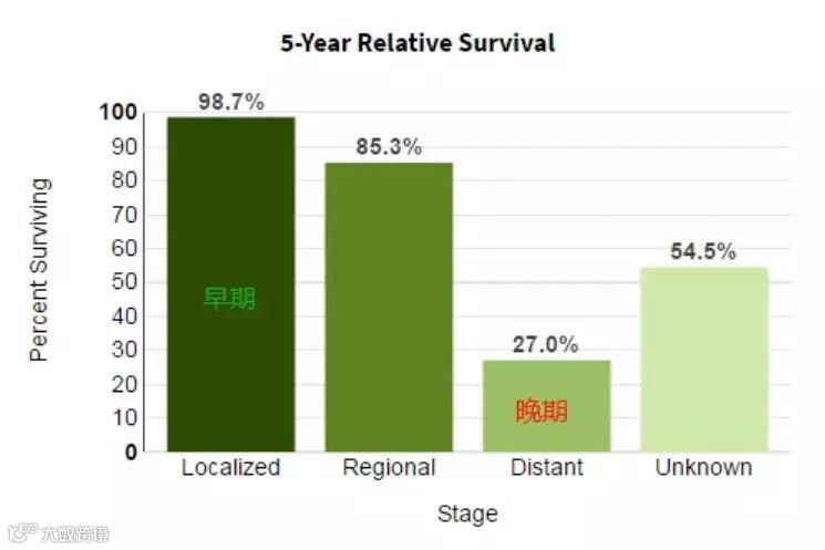 再比如说女性恶性肿瘤发病最高的乳腺癌,据美国国家癌症研究所数据显示,如果在早期发现,5年生存率高达98.8%,而拖到晚期有了远端转移后才发现,5年生存率则仅为27.4%。