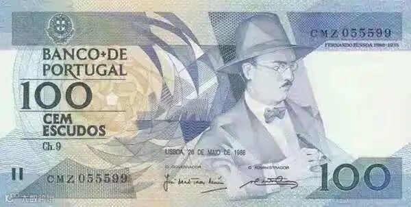 ▲ 葡萄牙发行图案为佩索阿的纪念纸钞