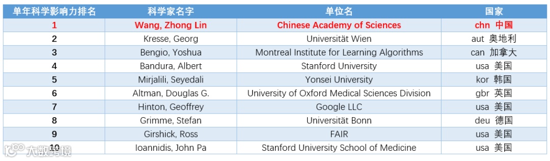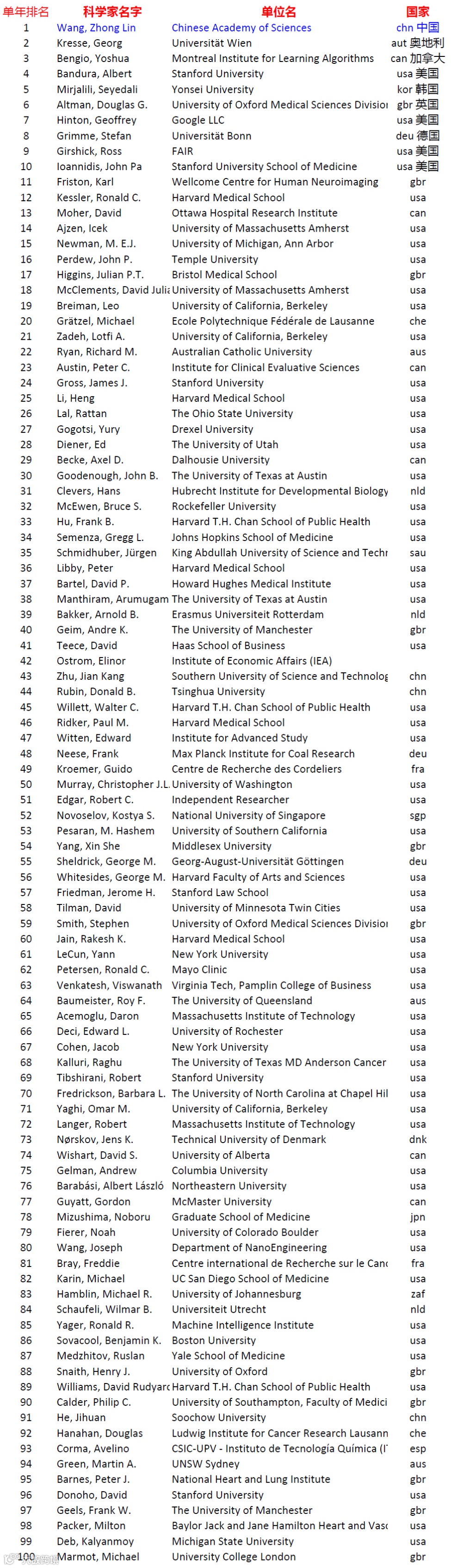 标准化引文指标的全科学作者数据库(science-wide author databases of standardized citation indicators)由世界著名的全球性信息分析公司——Elsevier BV推出,根据标准的Science-Metrix分类,构建了涵盖全球科学界22个领域、176个子领域的10万名顶尖科学家的公开数据。该数据库以全球最大的文摘和引文数据库—Scopus数据库为依据,基于引用次数(Citations)、H指数(H-index)、同行合作调整后的HM指数(Co-authorship adjusted HM-index)、不同作者单位论文的引用量(Citations to papers in different authorship positions)和一个综合指标(Composite indicator)等多达40多项指标的综合分析,为全球排名前10万的科学家进行大数据排名。该数据评分侧重于影响力(引文)而不是生产力(出版物数量)。职业长期影响力(Career-long impact)榜单统计了科学家职业生涯期间的综合影响表现;年度影响力(Single year impact)榜单则更集中于科学家上一年度的学术影响。这一排名被认为是最权威的大数据排名。