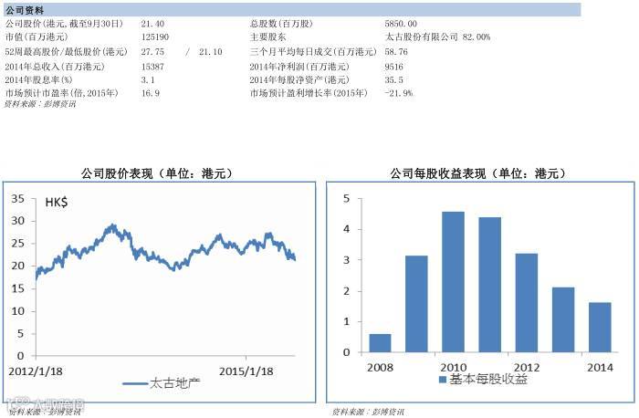 公司业务。2015年上半年,股东应占综合溢利为港币84.93亿元,撇除投资物业估值变动后,股东应占基本溢利同比增长4.5%至港币39.38亿元,主要反映零售及办公楼投资物业的收入增加,以及出售香港高尚住宅物业的溢利上升。来自物业投资的基本溢利同比增长4%,主要反映香港办公楼及中国内地零售物业的租金上升;来自酒店业务的溢利同比减少,主要反映香港的酒店表现较弱。期内,太古地产与远洋地产合作发展的零售项目成都远洋太古里正式开幕。该项目总楼面面积逾一百三十二万六千平方呎。此外,太古地产的附属公司与上海陆家嘴金融贸易区开发股份有限公司的附属公司达成框架协议,表明双方拟于上海浦东新区前滩联合发展一项总楼面面积约一百三十三万平方呎的零售项目。