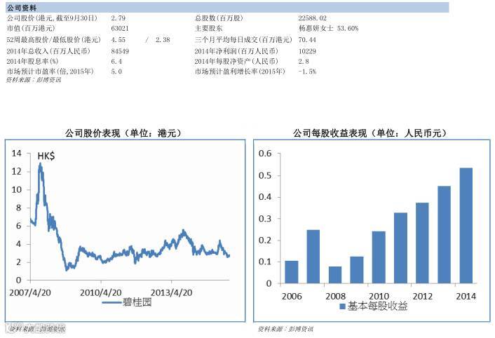 公司业务。2015上半年,公司销售额为545亿元(人民币,下同),销售面积为845万平方米。营业额同比增长24%至473亿元,其中物业开发的收入为455亿元,物业销售面积同比增长36%至725万平米。净利润同比下滑9%至49亿元,对应每股盈利为0.23元。新增土地面积为755万平方米。期内,公司成功引入中国平安作为战略投资者,使股权结构进一步优化,募得资金约合63亿港元,用于公司发展及一般运营资本。双方将于融资、投资、营销、小区业务等四个方面合作,共同完善房地产产业链。