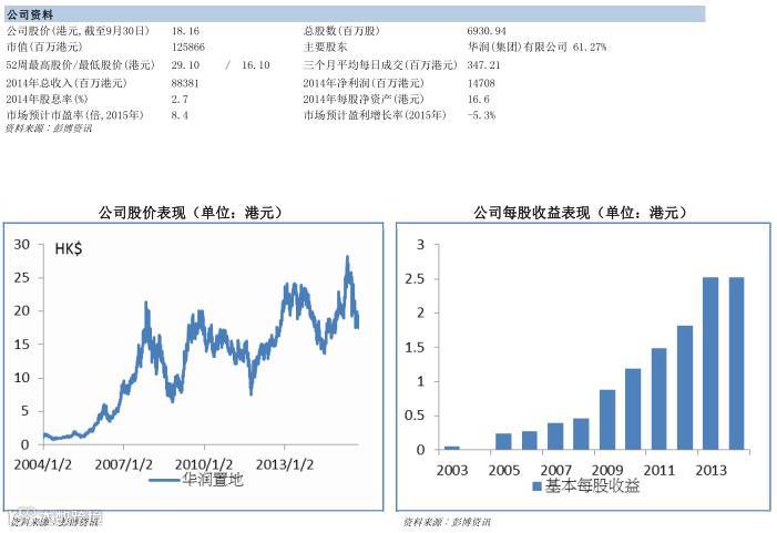公司简介。华润置地是大型央企华润集团旗下的地产业务旗舰,核心业务为综合型地产发展,1996年在香港交易所上市,2010年被纳入恒生指数成份股,成为香港蓝筹之一。公司坚持“住宅开发+投资物业+增值服务”的生意模式,住宅开发方面,已形成八大产品线:万象高端系列、城市高端系列、郊区高端系列、城市品质系列、城郊品质系列、城市改善系列、郊区改善系列、旅游度假系列。投资物业发展了万象城城市综合体、区域商业中心五彩城两种模式,在引领城市生活方式改变的同时,带动城市经济的发展、改善城市面貌。其中,万象城城市综合体项目已在深圳、杭州、沈阳、南宁、成都相继开业。