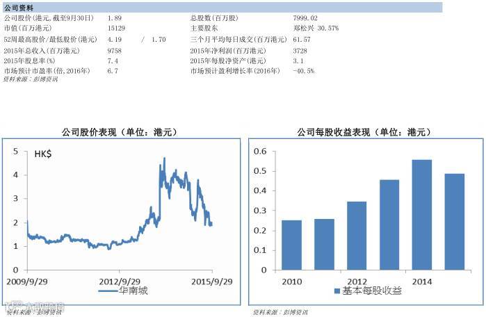 公司业务。2015财年,集团收入同比下跌27.6%至97.58亿港元,股东应占核心净利润同比下跌30.8%至18.54亿港元。集团指,业绩倒退主要受中国经济发展进入「新常态」增速放缓而影响。截至2015年3月31日,深圳华南城已购得约264万平方米总规划建筑面积100%的可建建筑面积,已完成约200万平方米建设,一期、二期及部分三期物业已投入运营。南昌华南城已购得约730万总规划建筑面积中约428万平方米的可建建筑面积,已完成约150万平方米建设,并已展开试运营。郑州华南城已购得约1,200万平方米总规划建筑面积中约517万平方米的可建建筑面积,已完成约191万平方米建设,并已于2014年8月展开试运营。集团同时丰富了收入来源,减少了对物业销售的依赖性,业务包括电子商贸、物流及仓储服务务、奥特莱斯运营及家居广场运营等。展望未来,凭借与腾讯更紧密的战略合作,集团正致力运用大型实体综合商贸物流及商品交易平台作为线下端口,合作建立在线线下(O2O)商贸生态系统。管理层表示,透过与微信合作,目标旗下的华南城网,网上商店数量由不足1万,增至八年后的50万。