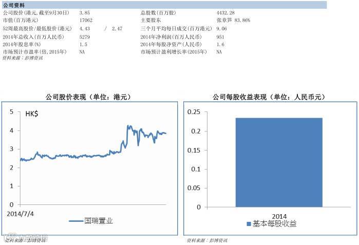 公司简介。国瑞置业成立于1994年,并于2014年7月在香港上市,是中国一家住宅物业开发商,并兼营商业物业业务,根据第一太平戴维斯报告,截至2014年3月31日,国瑞置业是北京二环内第二大的房地产开发商,市占率约为4.1%,且为北京第45大房地产开发商,市占率约为0.34%。国瑞置业业务主要分为四个部分:物业开发、一级土地建设及开发服务、物业投资以及物业管理和相关服务。定位方面,集团主力满足中上阶层客户需求,并计划在中国一线和二线省会城市的中央商业区开发甲级写字楼,集团计划以北京、珠江三角洲以及长江三角洲地区作为未来5至10年拓展业务的重点地区,把握当中商机。