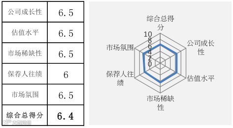 综合评分总得分 =(市场氛围评分 + 公司成长性评分 + 估值水平评分 + 市场稀缺性评分+保荐人往绩评分)之平均数