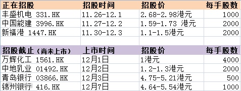 【新股】丰盛机电 331.HK、中国能建 3996.HK、新福港 1447.HK正在招股