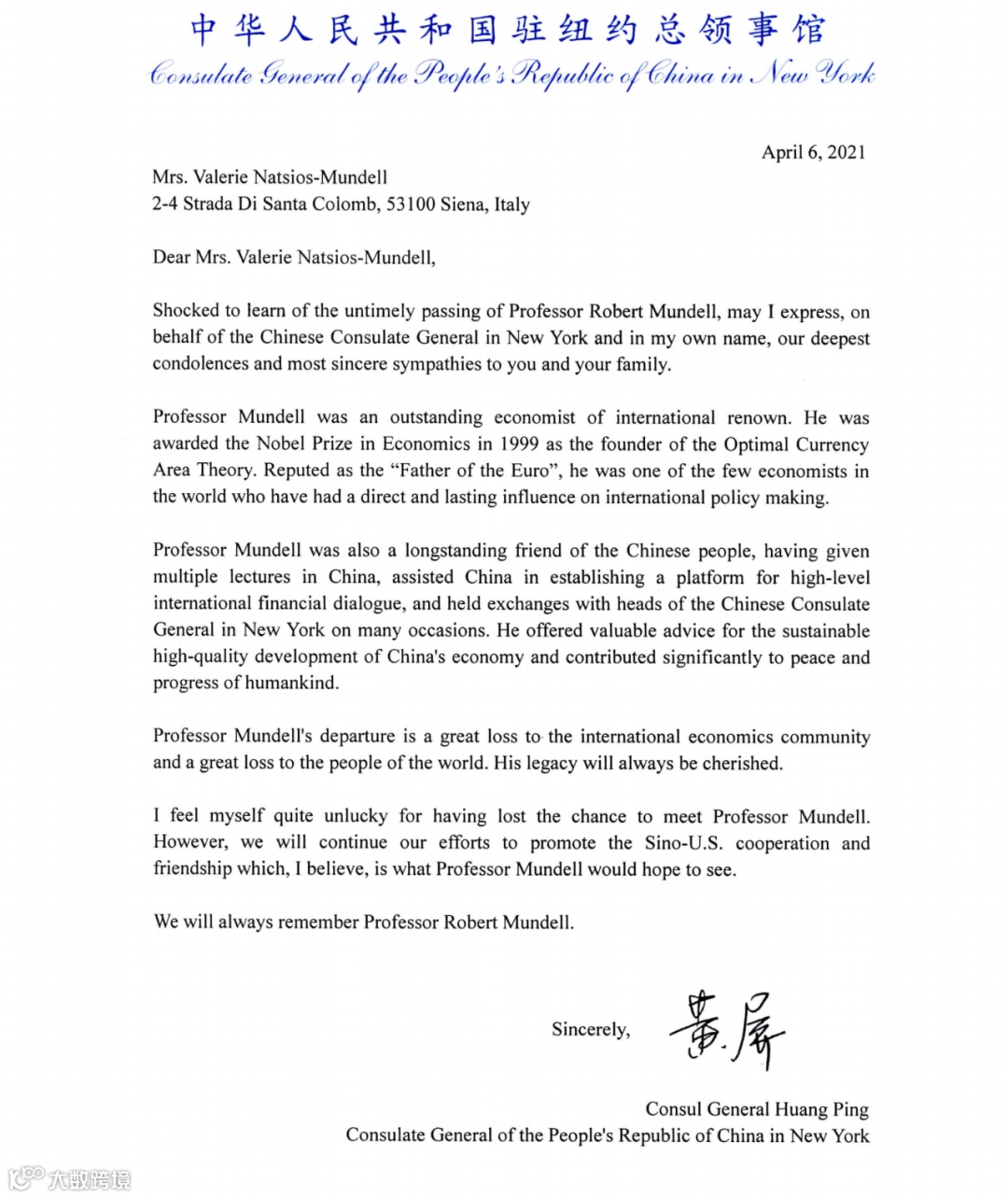 中华人民共和国驻纽约总领事馆发函吊唁欧元之父蒙代尔