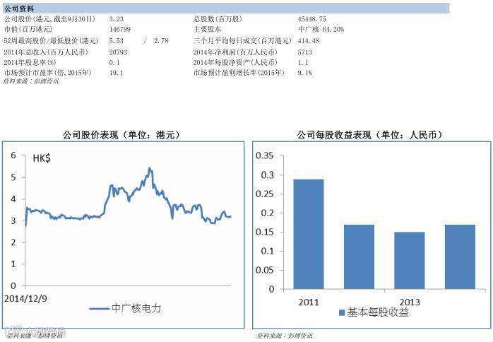 公司简介。公司控股股东为国务院国资委监管的特大型企业集团——中国广核集团,公司由10多家联属公司组成。2014年3月25日,中广核电力正式注册成立,注册资本353亿元人民币。截至2015年6月30日,集团运营管理的在运核电机组共13台,装机容量为13,799兆瓦,在建核电机组共10台,装机容量为12,290兆瓦,在运和在建核电机组总装机容量分别占中国大陆市场份额约为58.5%和 48.5%。公司股份分别于2014年12月22日加入富时指数、2014年12月24日加入MSCI中国指数、2015年3月9日加入恒生综合指数同时开始在沪港通交易、2015年6月8日加入恒生中国企业指数。