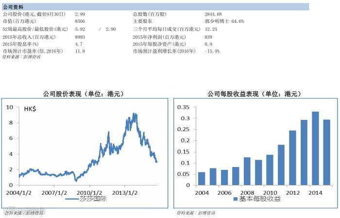 公司业务。2015财年(截至2015年3月底止)公司营业额同比增长2.7%至89.9亿港元,零售店数从280间增长287间。香港及澳门市场零售额增长3.3%至72.6亿元,同店销售增长2.2%,中国内地顾客占港澳市场零售额的71.5%,中国内地访港旅客的交易宗数上升17.4%,惟每宗交易平均销售金额下跌11.3%,零售店数增加1间至107间,经营溢利下跌11%至8.8亿港元。中国大陆市场营业额下跌4.6%至3.5亿港元,同店销售下跌5.6%,由于期内关闭了10间低效门店,经营亏损收窄55%至31百万港元。sasa.com营业额上升5.6%至4.2亿港元,微博粉丝由140万增加至210万。公司毛利率同比下降1.6个百分点至44.9%,原因是公司增加优惠推广及引入更多非独家品牌。凈利润同比下跌10.3%至8.4亿港元。公司预期下一个财年依然充满挑战,到访香港、澳门的内地旅客增长将继续放缓,公司将抓紧在线及线下的合作(O2O)及跨境电子商贸带来的商机。O2O业务最初将于香港推出,并逐步延伸至香港以外市场。于2016财年第一季(2015年4月1日至6月30日止),香港及澳门市场同店销售下跌6.8%。