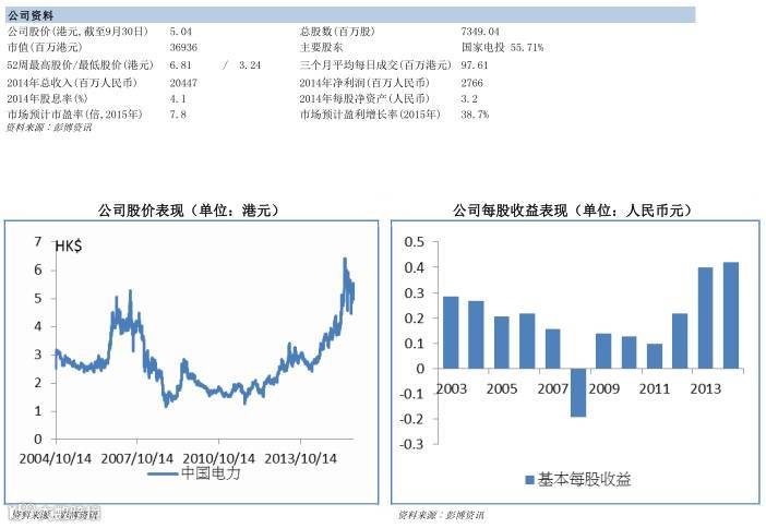 公司业务。2015年上半年,集团发电量约为81.53百万兆瓦时,比二零一四年同期减少约7.29%;上网电量约为76.31百万兆瓦时,比二零一四年同期减少约7.33%;发电机组平均利用小时为2,132小时,其中燃煤发电机组平均利用小时为2,399小时,供电煤耗为302.18克╱千瓦时,远低于全国平均水平。2015年上半年,集团实现营业额约为人民币303.57亿元,比二零一四年同期减少约9.43%,主要是上网电量同比减少及电价下调的影响。集团售电收入约为人民币283.18亿元,比二零一四年同期减少约9.31%;售热收入约为人民币18.19亿元,比二零一四年同期增长约4.16%;售煤收入约为人民币2.20亿元,比二零一四年同期下降约59.61%。2015年上半年,集团经营利润约为人民币80.65亿元,比二零一四年同期增长约15.66%;公司股东权益持有人应占本期间利润约为人民币35.59亿元,比二零一四年同期增长约28.73%,主要是集团单位发电燃料成本下降的影响。每股盈利约为人民币0.404元。