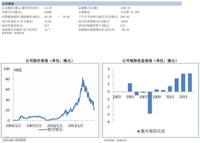 公司业务。2015年上半年,公司收益同比下降34%至254亿港元,经调整EBITDA下降43%至42亿港元,净利润下降66%至20亿港元。调整非经常开支后净利润下跌51%至30亿港元。上半年酒店入住率达96%。其中「澳门银河™」上半年收益同比下降31%至172亿港元,经调整EBITDA下跌41%至32亿港元。澳门星际酒店收益和经调整EBITDA均下降大概42%至71亿港元和11亿港元。「澳门百老汇™」项目仅运营35日,取得收益6400万港元,EBITDA为亏损200万港元。上半年,「澳门银河™」第二期及「澳门百老汇™」按如期顺利开幕。公司各项发展项目继续开展,路凼第三及四期图则已准备就绪,预定于2015年末或者2016年初开建;横琴一幅2.7平方公里的土地计划发展为以低层建筑物组成的低密度世界级渡假胜地;同时公司也在积极于海外市场发掘潜在商机。