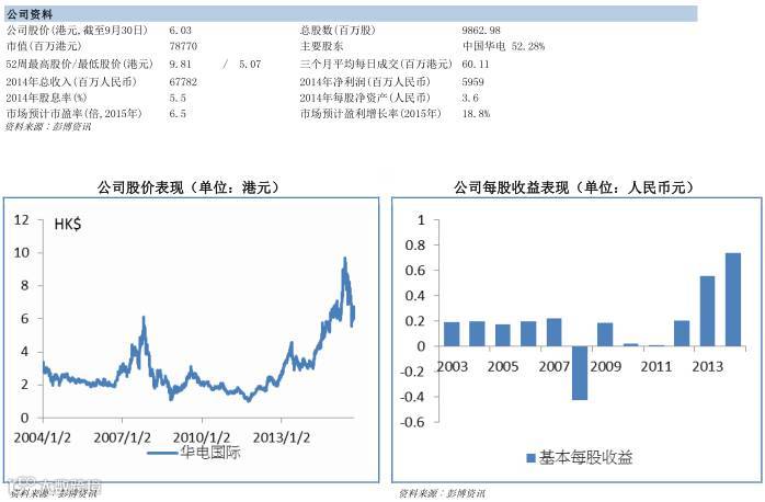 公司简介。华电国际主要业务为建设、经营发电厂和其它与发电相关的产业。公司下属电厂及公司地理位置主要处于电力负荷中心或煤矿区域附近。截至2015年上半年,公司已投入运行的控股发电厂共计49家,控股总装机容量为43,560.3兆瓦,其中控股燃煤及燃气发电机组共计39,171兆瓦,控股水电、风电、太阳能及生物质能等可再生能源发电机组共计4,389.3兆瓦。此外,公司控参股煤矿企业共计16家,拥有煤炭资源储量约22亿吨,预计拥有煤矿产能约1,000万吨/年。公司H股于1999年6月在香港上市,A股于2005年2月在上海上市。