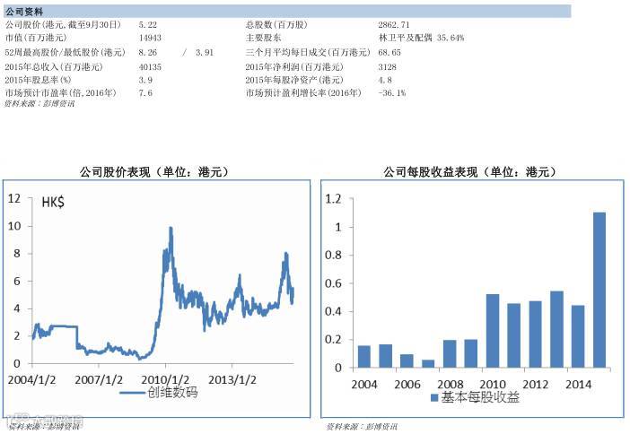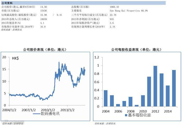 公司简介。公司于1996年10月在香港上市,为新鸿基地产发展(00016 HK)的附属公司。集团透过其覆盖全港的4G,3G HSPA+,2G网络,为客户提供话音、多媒体及宽频服务。2015年6月底,客户人数为196万。