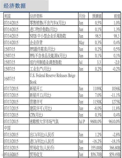 本周大市及板块焦点 欧元区财长要求希腊国会在本周三前通过紧缩开支法案,国会是否批準該改革方案,是环球股票市场今周走向的关键;另一方面,美国本周将公布多项重要经济数据,投资者将从中判断美联储的加息时间。此外,今周多家银行股及大型企業公布第二季度业绩,若业绩结果优于预期,或对美股带来提振。