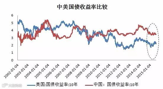 2、“利率底部”预期的证伪——国内利率有望进一步下行,甚至突破历史底部。一旦“滞胀”预期被证伪,那也意味着我们仍处于一种“量价齐跌”的衰退环境之中,国内的财政政策和货币政策都需要配合进行进一步的放松。但目前市场对于再次降息降准已经不抱希望(尤其是降息)——因为一是担心美国加息周期已临近,这会限制国内降息的空间。二是认为目前的利率水平已经处于近五年的底部位置,很难再往下。对于大家的第一个担心,我们认为目前美国的十年期国债收益率比中国的十年期国债收益率低120个基点,这种利差处于历史上的较高水平,即使美国在近期加息会抬高其国债收益率,也很难将如此巨大的利差迅速抹平,因此国内监管层并不必担心再次降息会导致套利资金的大量流出。对于大家的第二个担心,我们在两周前的周报中已经做了详细阐述,即中国的GDP中枢水平已从10%下移到7%,这有望带来利率中枢水平的下移,甚至可能带来利率水平突破历史底部,这为“股债双牛”奠定了基础(详细逻辑见报告《别在舒服的位子上睡觉》,2015-7-26)。