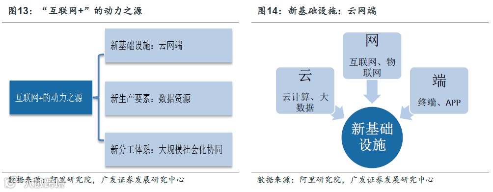 互联网颠覆传统行业的动力之源主要来自云网端、数据资源和大规模社会化协同三方面。随着云计算、大数据基础设施强势突破,互联网、物联网基础设施快速渗透,以及智能终端、APP应用异军突起,云网端已经成为叠加于原有基础设施之上的新基础设施。大数据作为“互联网+”时代的新生产要素,正在从以控制为出发点的IT时代走向以激活生产力为目的的DT数据时代。而包含了共享经济、网络协同和众包合作等方面的大规模、社会化协作也在不断冲击传统的企业边界、生产组织体系和劳动雇佣关系。