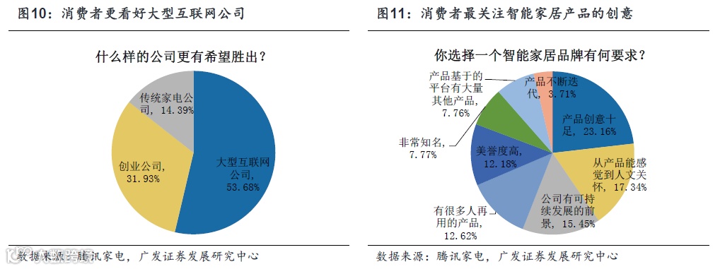 智能家居的核心在于“智能”,对传统家居产品来说,这是一场变革,而非单纯的改进。这一点可以在腾讯家电的消费者调研中得到体现,50%以上的消费者认为大型互联网公司更有希望胜出,而消费者在选择智能家居品牌时最关注的是“创意”和“人文关怀”,这些属性都更契合互联网公司的文化。从这个角度看,传统制造商并不因为其产品生产经验而具备优势,创意和文化等互联网元素才是企业最核心的竞争力。