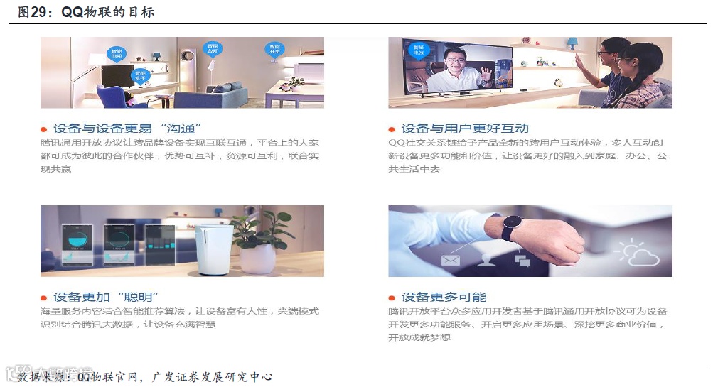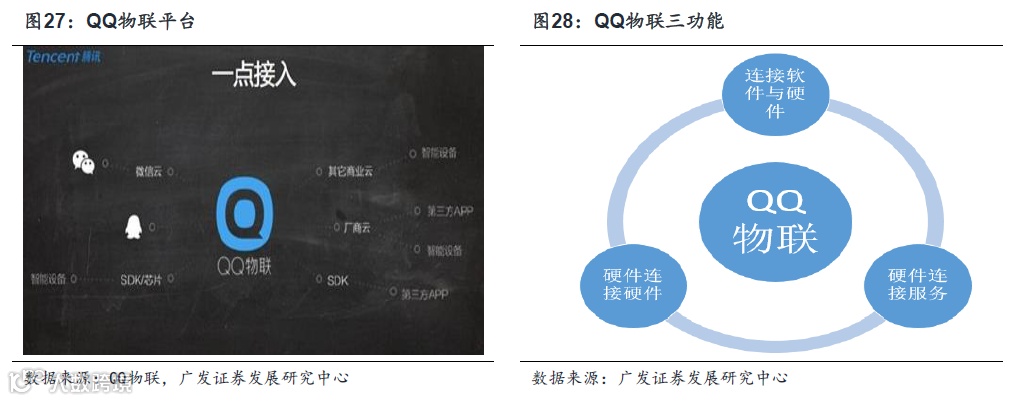 与阿里类似,腾讯在智能家居领域的布局也是凭借平台,寻求硬件制造合作者。腾讯最大的优势在于其拥有的8亿QQ活跃用户、4亿微信用户以及1亿应用宝用户。基于大规模用户构建的平台优势,腾讯推出了QQ物联平台,平台功能定位于软件连接硬件、硬件连接硬件、硬件连接服务。与阿里巴巴搭建生态圈的战略类似,腾讯希望将QQ物联打造成为一个硬件创业扶持基地,从而建立包括资金、设计、研发、销售、传播等环节在内的智能家居生态圈。目前,腾讯QQ物联的首批合作企业有康佳、英特尔、NXP、美国博通、丰唐物联、康康血压等诸多国内外知名硬件制造商,产品类别横跨智能家居、可穿戴设备、智能车载、健康设备等领域。