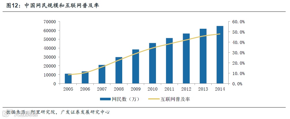 从“互联网+”的颠覆性上看,50%以上消费者更看好大型互联网公司有其合理性,“互联网+”已成为我国经济增长的新引擎。互联网行业经过十多年的发展,我国网民规模已达6.5亿。2003年,我国网民数仅为0.79亿,网民渗透率为4.6%,到了2014年,我国网民数为6.5亿,智能手机用户为5亿,网民渗透率达到48%,11年间我国网民数增长了8倍。大规模的网络连接和变革力量已经开辟出一个崭新纪元——“互联网+”时代。中国目前已经成为全球最大的智能终端市场,互联网规模是美国的两倍,相较于其他国家,更广泛的信息设备安装、更大规模的在线人数和薄弱的工业经济基础,使互联网在中国将更具颠覆性。
