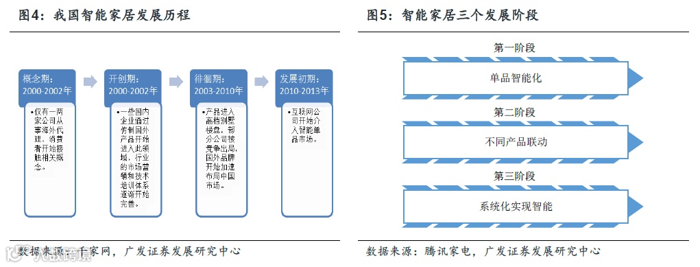 经过10多年的发展,我国智能家居行业经历了概念期、开创期、徘徊期,尚没有重大突破,在互联网巨头加速介入之后,行业正式步入发展初期。从产品形态角度看,智能家居的发展可分为三个阶段:单品智能化、不同产品之间联动和系统化实现智能。作为一个庞大的生态系统,智能家居行业的发展是一个循序渐进的过程,即单品率先实现智能化,而后不同智能单品之间不断进行联动并逐渐进化变革,最终每个产品能够无缝接入,家居产品系统化实现智能。目前我国智能家居行业尚处发展初期,单品智能化的实现正处加速发展阶段,用户规模偏小且产品之间尚未实现联动。