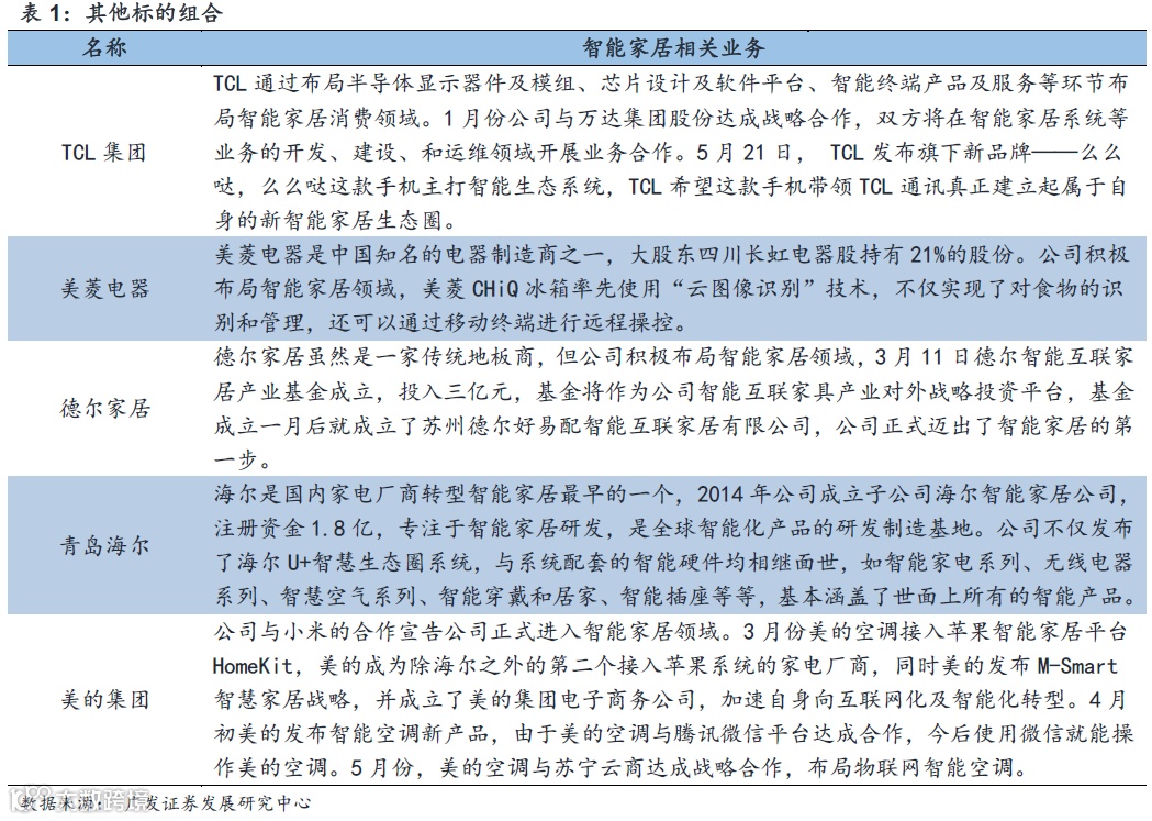 在“与互联网巨头有合作”且“适用范围广的轻量化硬件生产商”两条主线下,可重点关注:英唐智控、北京君正、科大讯飞。此外,建议关注在智能家居领域加快布局且与互联网巨头建立合作关系的硬件企业:TCL集团、美菱电器、德尔家居、青岛海尔、美的集团。
