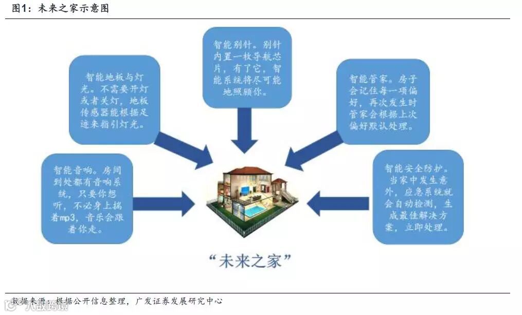 在“未来之家”里,客人进门时要戴上一枚内置芯片的别针,别针中的内置电脑能够随时显示客人所处的位置并记下他们的详细资料,在智能管家的辅助下房间里的音乐、照明、温湿度、画作能够根据客户的偏好进行调节,以此实现智能音乐、智能照明和智能温控等。“未来之家”也能够实现智能安全防护,一方面住宅门口的微型摄像机能够在其他人进门前通知主人并听从主人的指令,另一方面当家中发生意外时,应急系统能够自动检测并生成最佳解决方案。比尔﹒盖茨的“未来之家”为我们打开了智能家居场景的想象空间,随着技术的不断进步,“未来之家”离普通消费者也越来越近。