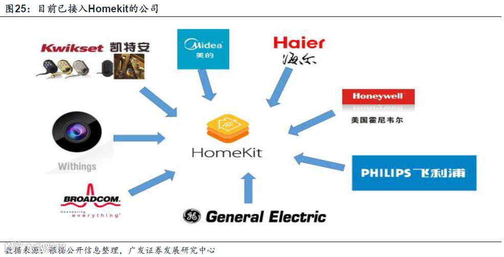 苹果在智能家居上的操作手法与谷歌相反,但最终目的都是一样——实现软硬件结合,尽管苹果在智能家居起步较晚,但基于其在物联网领域的优势,极具竞争力。结合苹果在物联网领域的平台优势,其在战略上偏向于以软件带动硬件。2014年6月,苹果在全球开发者大会(WWDC)上推出了其智能家居平台Homekit。Homekit整合了Siri语音功能,可让用户通过iPhone和iPad等设备实现对门锁、窗帘、照明、恒温器等家居设备的控制。同时,该平台对第三方智能家居硬件产品进行Made for iPhone(MFI)认证,借此提升设备互联的便捷性,让用户的智能家居操作更为简单。Homekit自身并不生产硬件,但是它向第三方开放应用程序接口(API),第三方硬件产品只要符合MFI认证就可以接入。目前,美的、海尔、飞利浦和霍尼韦尔等制造商已经与苹果建立合作关系,而首批支持HomeKit平台的智能家居设备将于2015年6月上市。