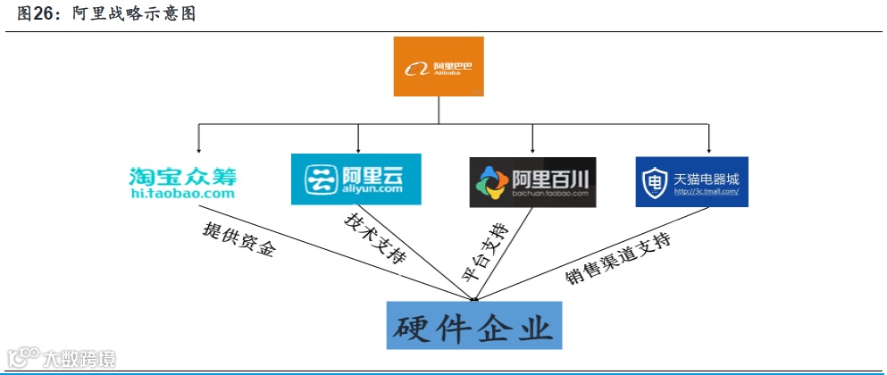 阿里在智能家居领域的发展战略也是基于平台优势,积极寻求与硬件制造商的合作,进而搭建完整的生态圈。具体来看,阿里凭借自己的销售渠道、大数据、云计算等核心优势在智能家居领域推出淘宝众筹、智能云、百川计划和天猫电器城四大业务板块,其中,淘宝众筹主要是为专注于智能硬件制造的创业企业提供资金,智能云提供技术支持,百川计划为企业移动应用开发提供平台支持,天猫电器城则凭借流量优势提供销售渠道支持。阿里巴巴在智能家居领域的布局基本涵盖了孵化、资金、技术、生产、销售等产研销环节,并实现了对大中小型硬件公司全覆盖。目前,海信、科龙、格兰仕、艾美特、海尔、科沃斯、长帝等100多家企业已加入阿里智能家居生态圈。