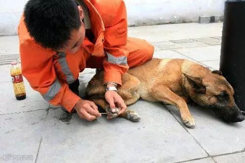 连续工作体力不支,打点滴的搜救犬