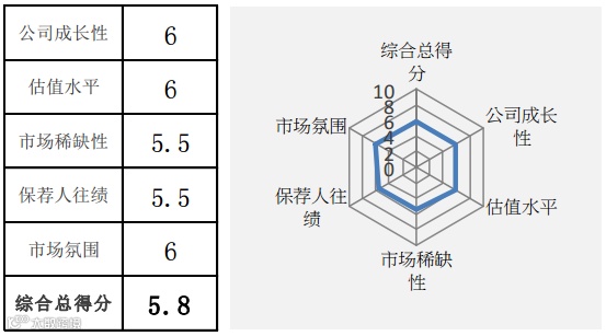 综合评分总得分 =(市场氛围评分 + 公司成长性评分 + 估值水平评分 + 市场稀缺性评分+保荐人往绩评分)之平均数