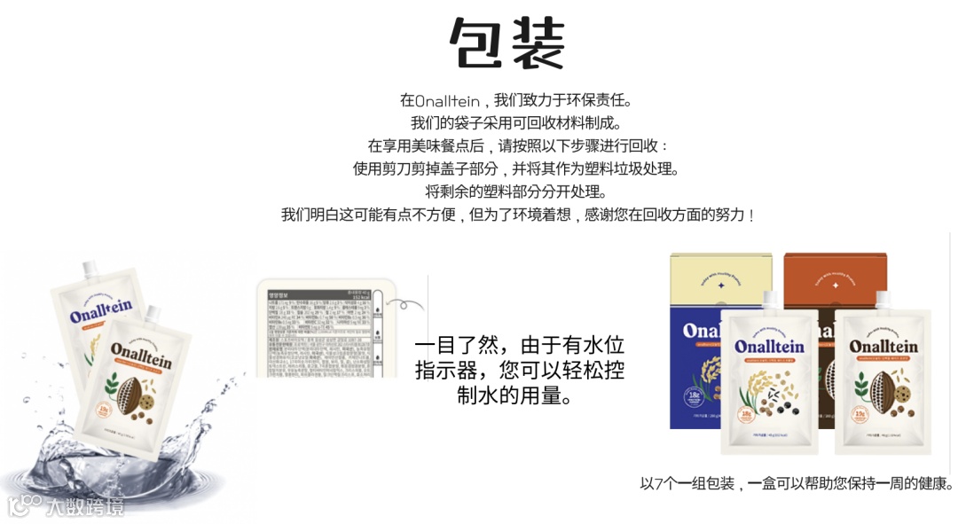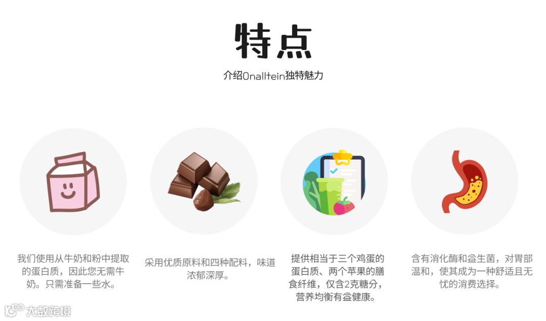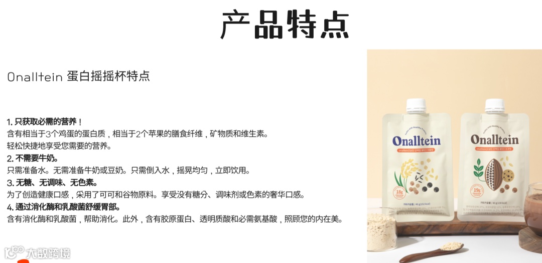 导读:Onalltein是从牛奶和豆浆中提取的蛋白质,为您带来美味和健康。一袋摇摇杯,含有相当于3个鸡蛋的蛋白质,2个苹果的膳食纤维、矿物质和维生素。轻松快捷的享受您需要的营养